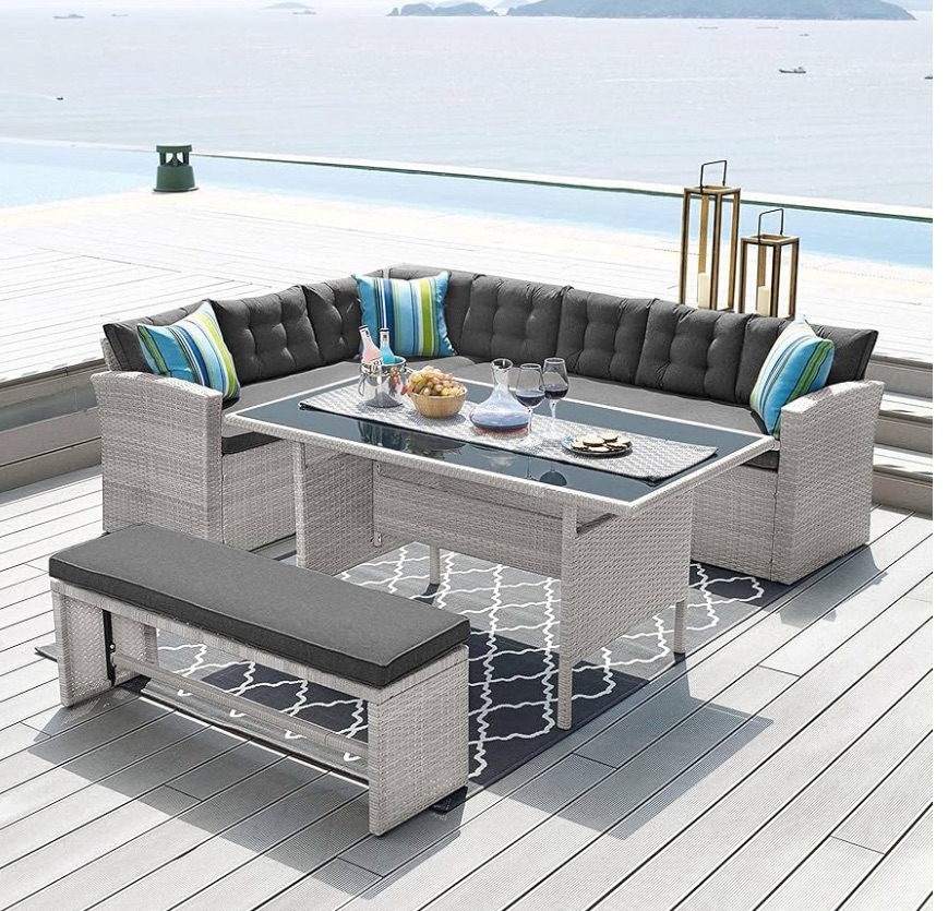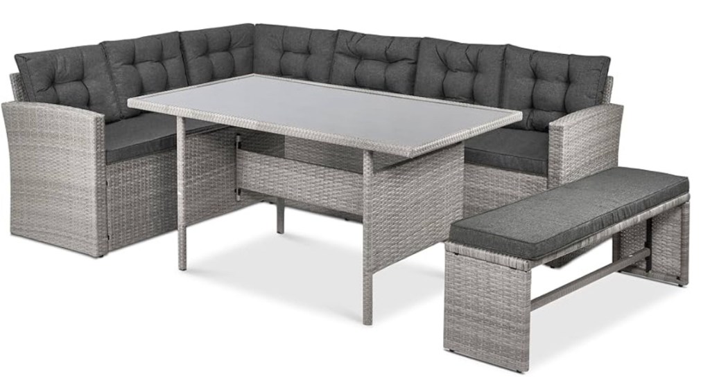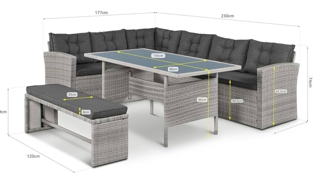 Bravich Elba 8-10 Seater Grey Rattan Outdoor Garden Furniture Set. Weatherproof Corner Garden Furniture, Garden Sofa, Bench & Dining Table FREE RAIN COVER